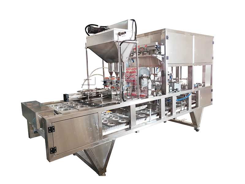 本機采用合理的機械傳動,功能齊全,灌裝、封口、切邊、制品推出,廢料收卷,印碼等自動化工作,可節(jié)約人力,降低成本。本機有二次熱封裝置,料杯/碗/盒與封膜經(jīng)過前后二次熱封,封口牢固可靠。
