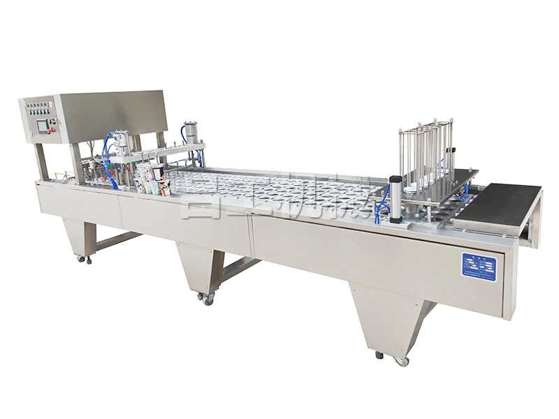 本機(jī)采用合理的機(jī)械傳動(dòng),功能齊全,灌裝、封口、切邊、制品推出,廢料收卷,印碼等自動(dòng)化工作,可節(jié)約人力,降低成本。本機(jī)有二次熱封裝置,料杯/碗/盒與封膜經(jīng)過前后二次熱封,封口牢固可靠。